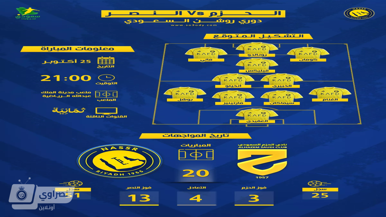 على الجانب الآخر، الحزم يتسلح بأرضه وجماهيره لمواجهة النصر من أجل تحقيق قفزة دوري روشن، حيث يأتي بالمركز 12 برصيد 5 نقاط.