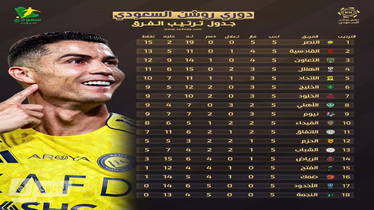 **ترتيب فرق دوري روشن السعودي للمحترفين بعد نهاية الجولة الخامسة:**