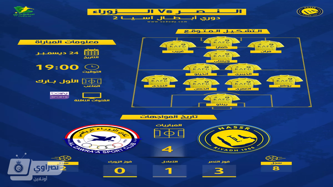 يستضيف النصر، نظيره الزوراء العراقي في السابعة مساء الأربعاء، الموافق 24 ديسمبر 2025، على ملعب الأول بارك، ضمن لقاءات الجولة السادسة من مباريات المجموعة الرابعة لدوري أبطال آسيا 2.
