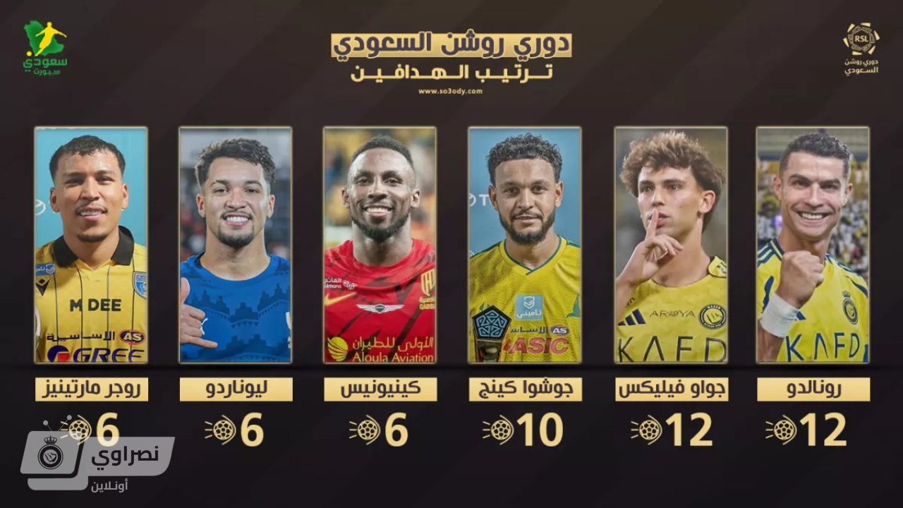 فرض نادي النصر سيطرته على قمة ترتيب الهدافين، بعدما تصدّر الثنائي البرتغالي كريستيانو رونالدو وجواو فيليكس المشهد الهجومي، بتسجيل 12 هدفًا لكل منهما، ليؤكد «العالمي» تفوقه الهجومي وقدرته على الجمع بين النتائج الإيجابية والأرقام الفردية المميزة.