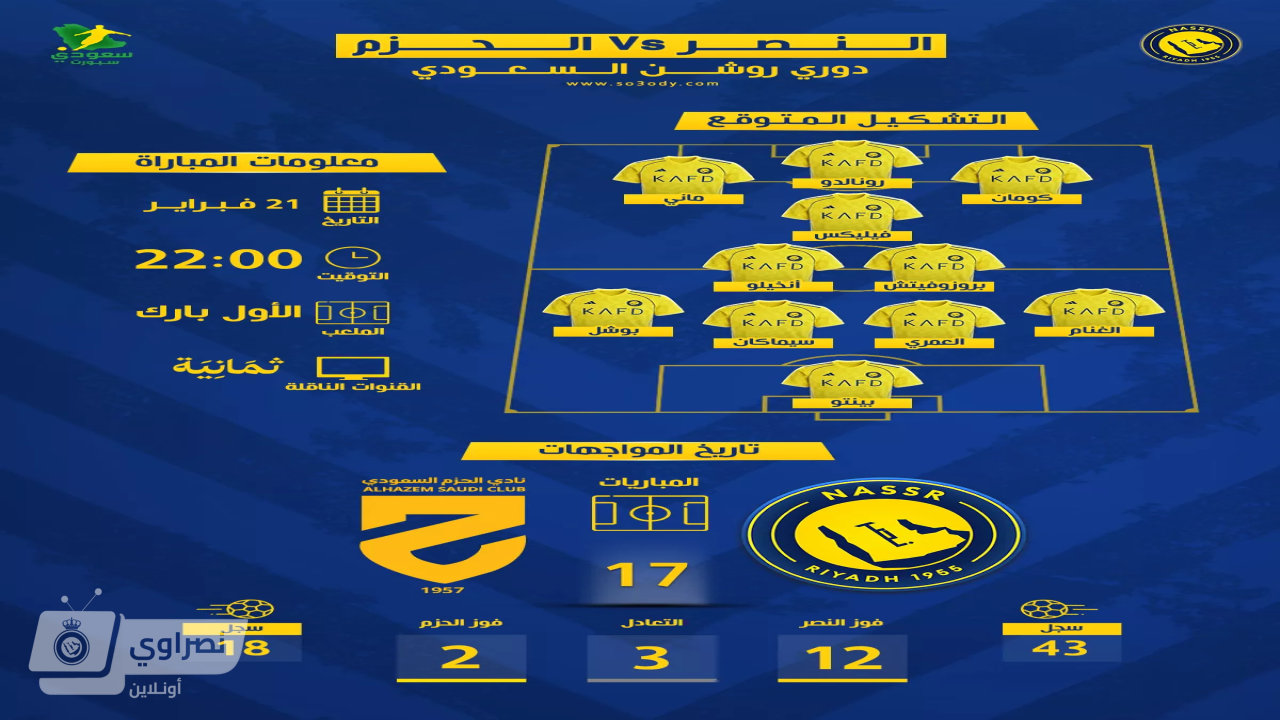 موعد مباراة النصر والحزم والقنوات الناقلة