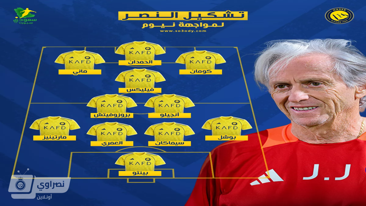 أعلن البرتغالي خورخي خيسوس، المدير الفني لنادي النصر، تشكيل الفريق الرسمي، ضد نيوم، ضمن لقاءات الجولة 25 من منافسات دوري روشن السعودي.